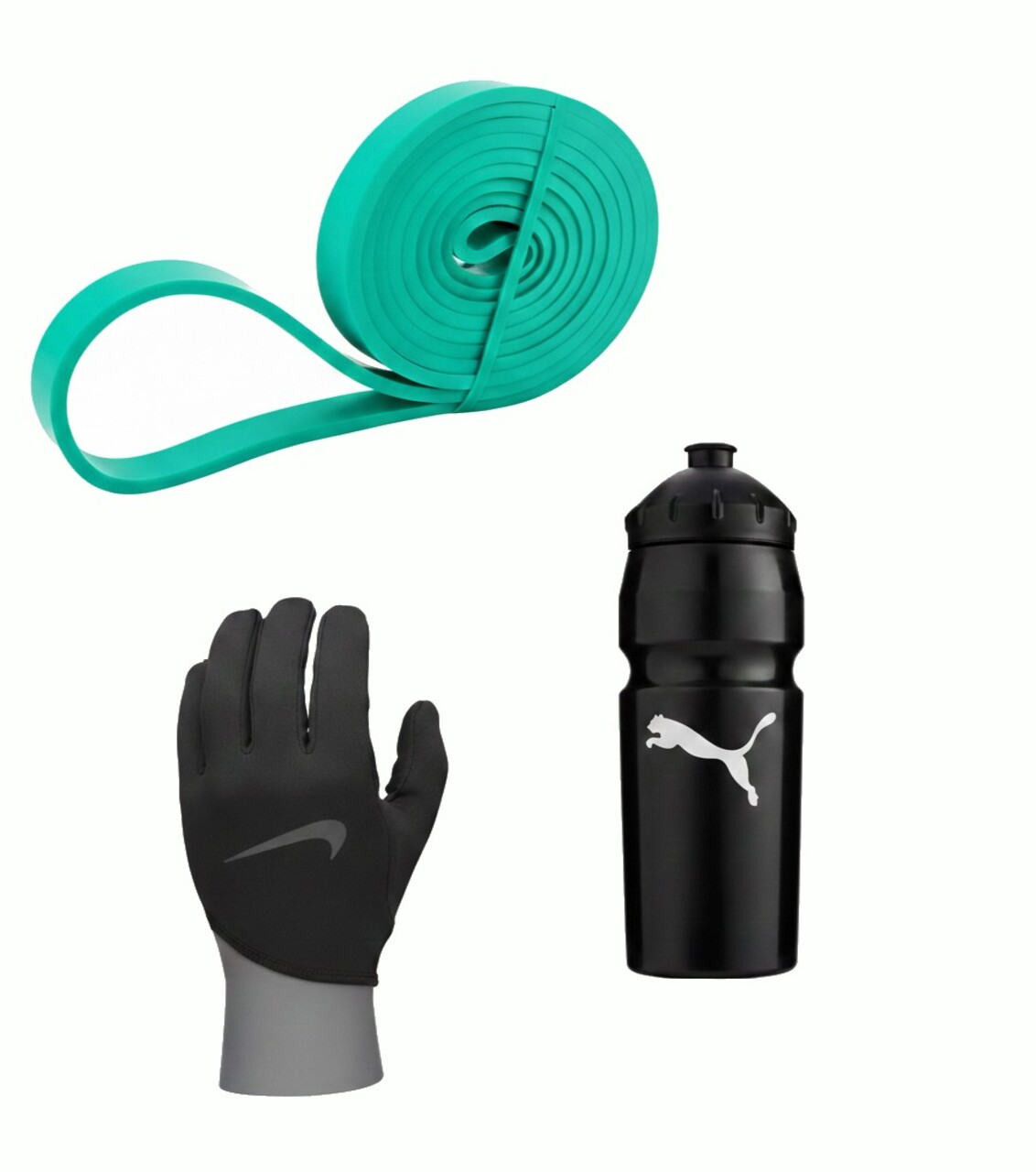 Este lote incluye una banda elástica de resistencia, una botella deportiva reutilizable y unos guantes fitness antideslizantes, proporcionando todo lo necesario para realizar entrenamientos completos y seguros.